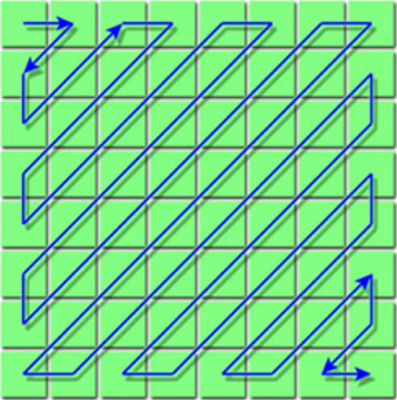 Another significant contribution of the authors is that they successfully introduce a representation method for the input mask layout which makes the further calculation they complete computationally feasible. The discrete cosine transform (DCT) is applied to the input mask layout, and first hundreds of the DCT coefficients is collected in the Zig-Zag order (Shown in Figure 5.) as the input feature vectors of the linear model to be trained.