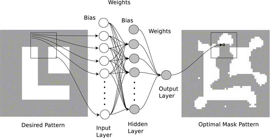 [36]. The author considering the estimation of the binary value of the central pixel of the square modified mask pattern by the standard three layer neural network with the original pixel level binary mask pattern as the input instead of estimating the motion of the central fragment. To obtain the whole modified mask pattern, the author has to scan the three layer model over the original mask pattern. The schematics of the NN is shown in Figure 6. Such kind of scanning can be done naturally by the introduction of the convolutional neural networks and the three layer neural network above can actually be treated as the convolutional layer.